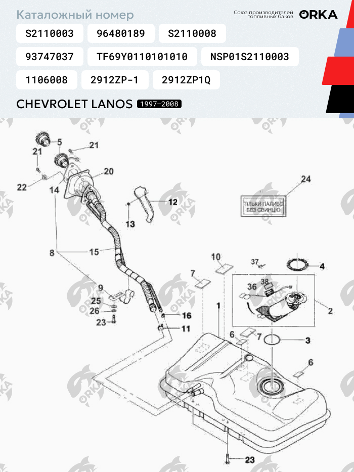 Бак Дэу / Део Ланос (Шевроле Ланос) полностью соответствует оригинальному заводскому - форма и габариты, расположение технологических отверстий и пазов креплений. Бензобак имеет выштамповку оригинала и имеет идентичную вместимость топлива! Топливозаборник устанавливается штатный. В комплекте вместе с баком идут резино-бензостойкие прокладки под дачтик и топливозаборник. Бак имеет 2 перегородки для предотвращения гидроударов топлива.
