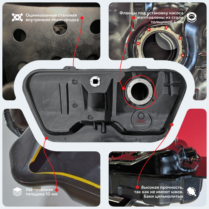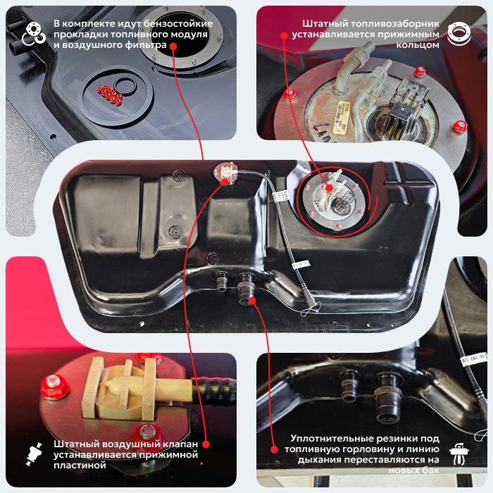 Замена старого бака на новый пройдет без лишних проблем, вся аппаратура полностью переставляется со старого бака. В бензобак мы установили оцинкованную перегородку для предотвращения гидроударов топлива. На баке так же установлено дополнительно стальное, усиленное кольцо под ваш родной топливозаборник - для более плотного прилегания бензостойкой прокладки топливозаборника (она идет уже в комплекте с баком). Погружной модуль прижимается прижимным кольцом нашего производства, воздушный клапан прижимается нашим креплением. Все под ключ, все в комплекте вместе с баком, вплоть до усиленных болтов крепления.